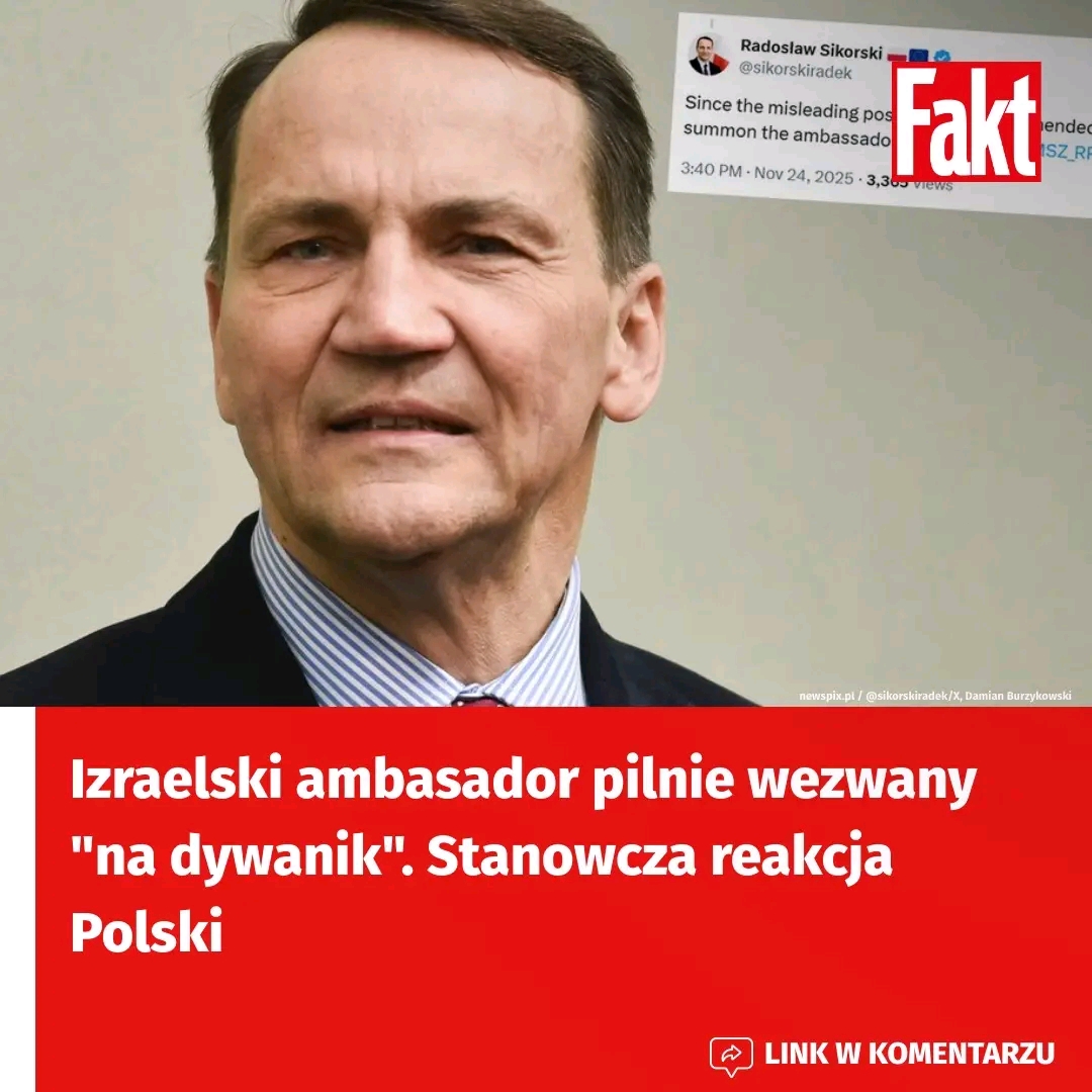 Sikorski odpowiedział na ten wpis na X, oznaczając konto Jad Waszem i pisząc: “Proszę doprecyzujcie, że była to Polska pod »niemiecką okupacją«”. Teraz minister poinformował, że wpis wprowadzający w błąd nie został poprawiony. Dlatego zadecydował o wezwaniu ambasadora Izraela w Polsce do Ministerstwa Spraw Zagranicznych.