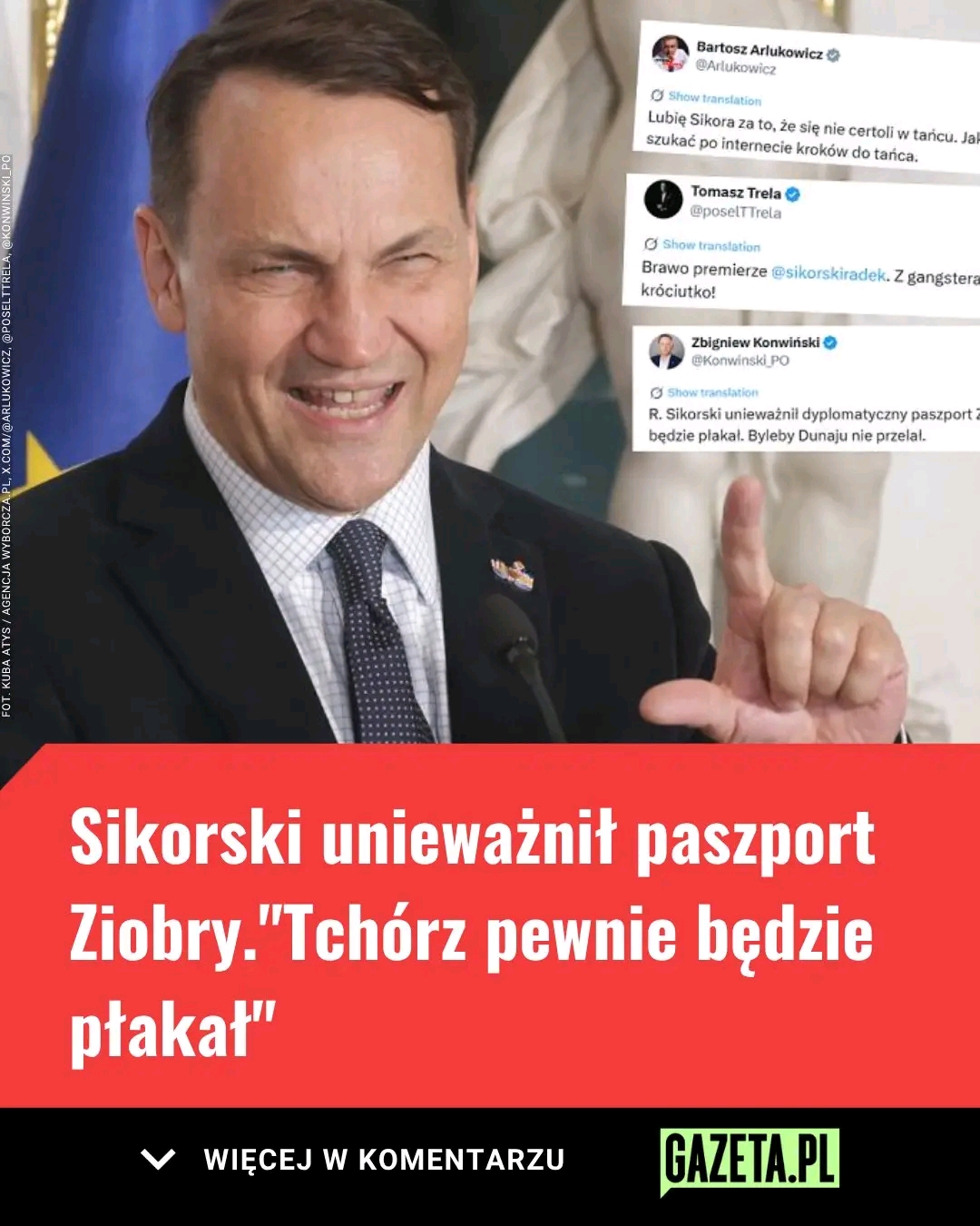 “Lubię Sikora za to, że się nie certoli w tańcu. Jak tańczyć to tańczyć, a nie szukać po internecie kroków do tańca” – tak decyzję szefa MSZ o unieważnieniu paszportu dyplomatycznego Zbigniewowi Ziobrze skomentował Bartosz Arłukowicz. “Minister Sikorski, na wniosek Prokuratury Krajowej unieważnił paszport dyplomatyczny Zbigniewa Z. A wybory na Węgrzech coraz bliżej” – napisała natomiast Kamila Gasiuk-Pihowicz. “Brawo! Na wniosek Prokuratury Minister Spraw Zagranicznych Radosław Sikorski unieważnił paszport dyplomatyczny Zbigniewa Z.” – cieszył się Dariusz Joński.