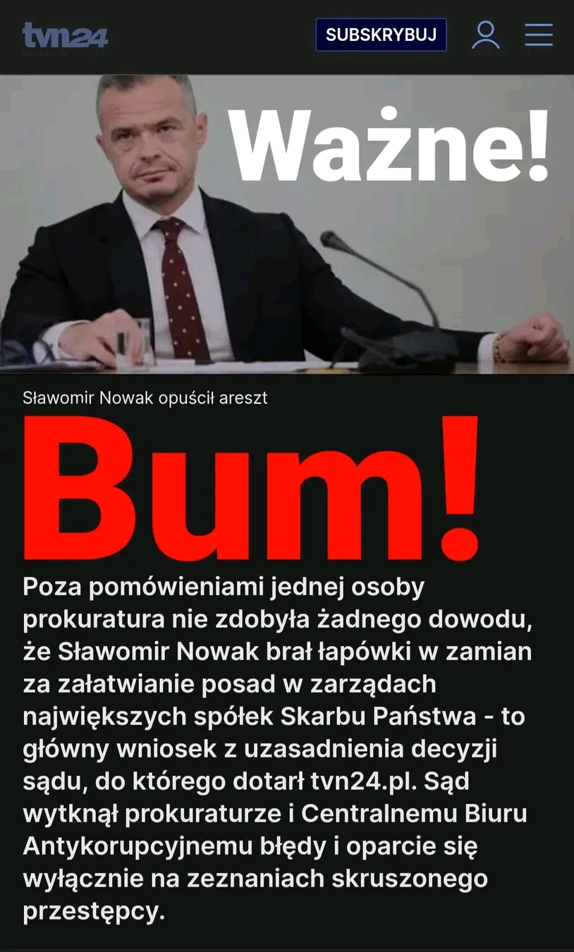 Poza pomówieniami jednej osoby prokuratura nie zdobyła żadnego dowodu, że Sławomir Nowak brał łapówki w zamian za załatwianie posad w zarządach największych spółek Skarbu Państwa – to główny wniosek z uzasadnienia decyzji sądu, do którego dotarł tvn24.pl. Sąd wytknął prokuraturze i Centralnemu Biuru Antykorupcyjnemu błędy i oparcie się wyłącznie na zeznaniach skruszonego przestępcy.