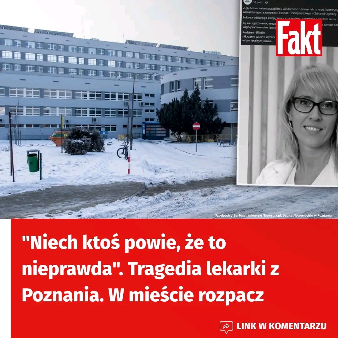 Smutek w Poznaniu. Nie żyje ceniona lekarka. O śmierci pani doktor poinformował Szpital Wojewódzki, a także Fundacja Trzy Serca im. Prof. Mariana Zembali. “Jej odejście pozostawia pustkę, której nie da się wypełnić. Dr Katarzyna Smykał-Jankowiak była nie tylko wybitnym specjalistą, lecz także gorącą orędowniczką idei transplantacji – idei, która dla niej zawsze miała ludzką twarz” — napisano. Pacjenci, których uratowała lekarka, są w rozpaczy. Wielu nie dowierza, że już nigdy jej nie zobaczą. “Niech ktoś powie, że to nieprawda”, “Byłaś Aniołem” — piszą w sieci ludzie. Pani doktor miała 44 lata. Chorowała na nowotwór.