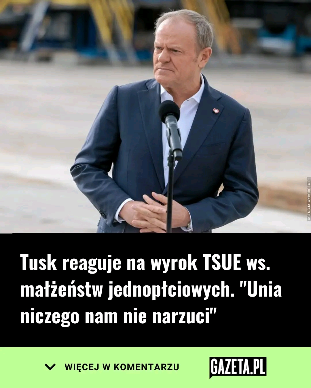 Tusk podkreślił, że wyrok nie ogranicza swobody Polski w kształtowaniu przepisów dotyczących związków partnerskich i małżeństw. – Nie jest tak, że Unia Europejska nam cokolwiek może w tej kwestii narzucić. Jak wiecie, pracujemy nad własnymi przepisami prawa, które będą to regulowały. W sposób taki, jaki większość Polaków, poprzez większość parlamentarną, uzna za stosowny – powiedział premier przed posiedzeniem rządu. Rzecznik rządu na konferencji w środę dodał kolejne informacje w tej sprawie. – Tutaj nie ma nic do narzucenia Polsce, ponieważ ten wyrok, który zapadł, nie wprowadza obowiązku wprowadzenia w Polsce instytucji małżeństw jednopłciowych. Kwestie prawa małżeńskiego pozostają w wyłącznej kompetencji państw członkowskich UE – dodał Adam Szłapka.