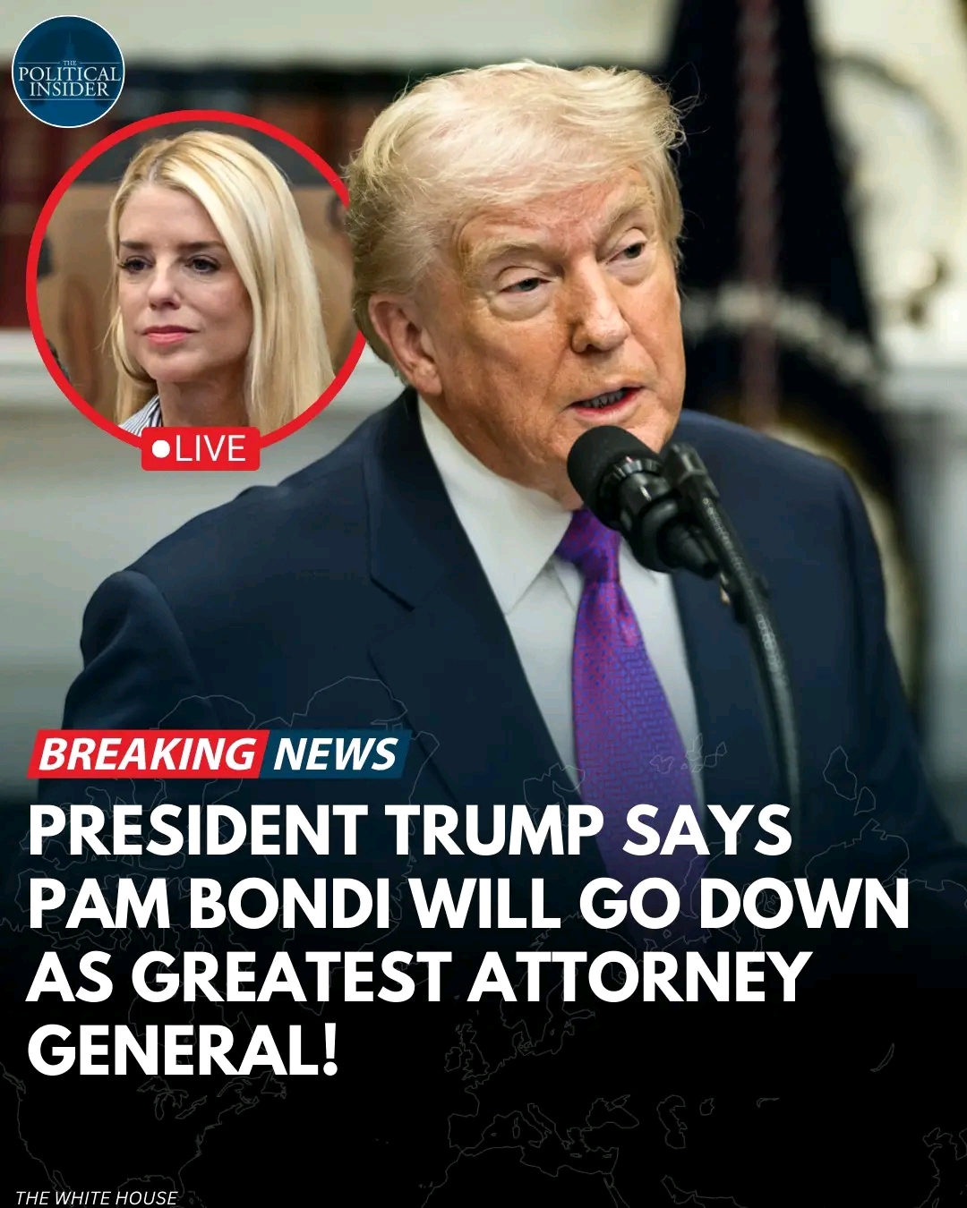 President Donald Trump said Pam Bondi will be remembered as “the greatest attorney general in American history,” praising her legal experience, loyalty, and what he described as a relentless defense of justice and constitutional principles.