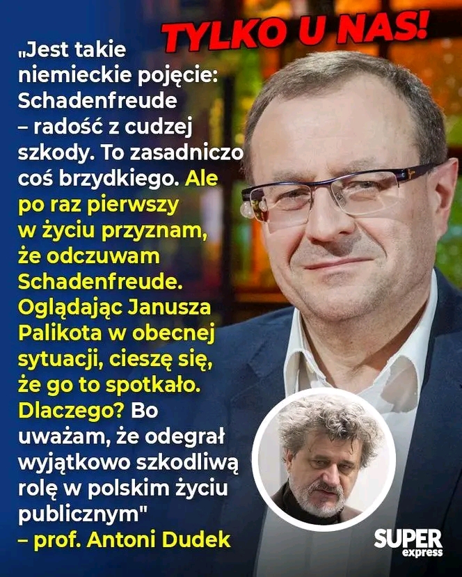 Prof. Antoni Dudek w programie „Dudek o polityce” na kanale YouTube „Super Expressu” odniósł się do sytuacji Janusza Palikota, który publicznie narzekał, że stracił cały majątek i liczy na datki. – Jest takie niemieckie pojęcie: Schadenfreude – radość z cudzej szkody. To zasadniczo coś brzydkiego. Ale po raz pierwszy w życiu przyznam, że odczuwam Schadenfreude – komentuje politolog. – Oglądając Janusza Palikota w obecnej sytuacji, cieszę się, że go to spotkało. Dlaczego? Bo uważam, że odegrał wyjątkowo szkodliwą rolę w polskim życiu publicznym – wyznaje historyk.