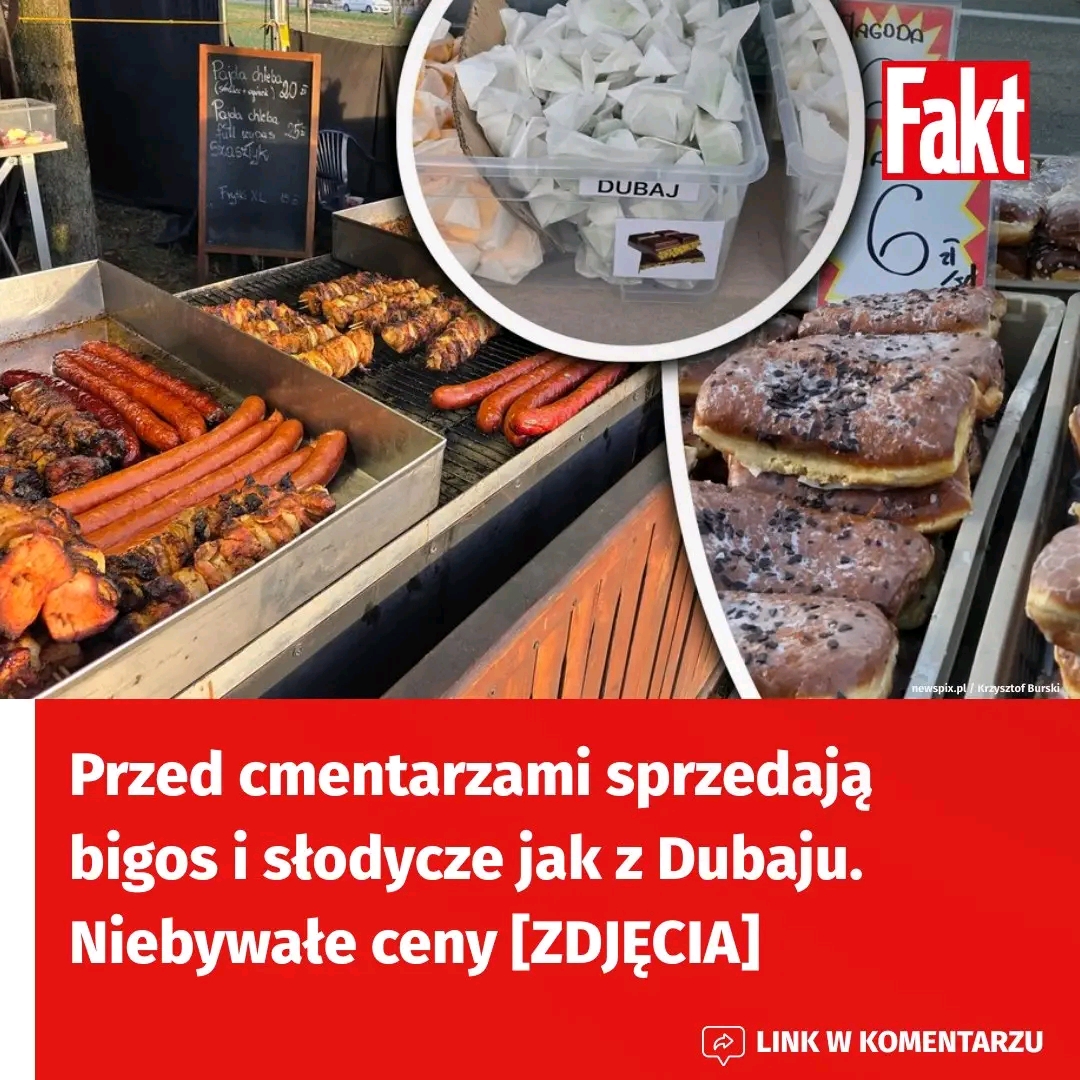 1 listopada Polacy wspominają tych, którzy odeszli. Teren przy niektórych nekropoliach można jednak pomylić z jarmarkiem. Jak przekonał się reporter “Faktu”, pod warszawskimi cmentarzami sprzedają nie tylko znicze i kwiaty, ale nawet kiełbasy. Gastronomiczną nowością… dubajskie przysmaki. Taki rarytas jak kołacz z dubajską czekoladą kosztuje — bagatela — 21 zł. Zerkamy na przycmentarne cenniki.