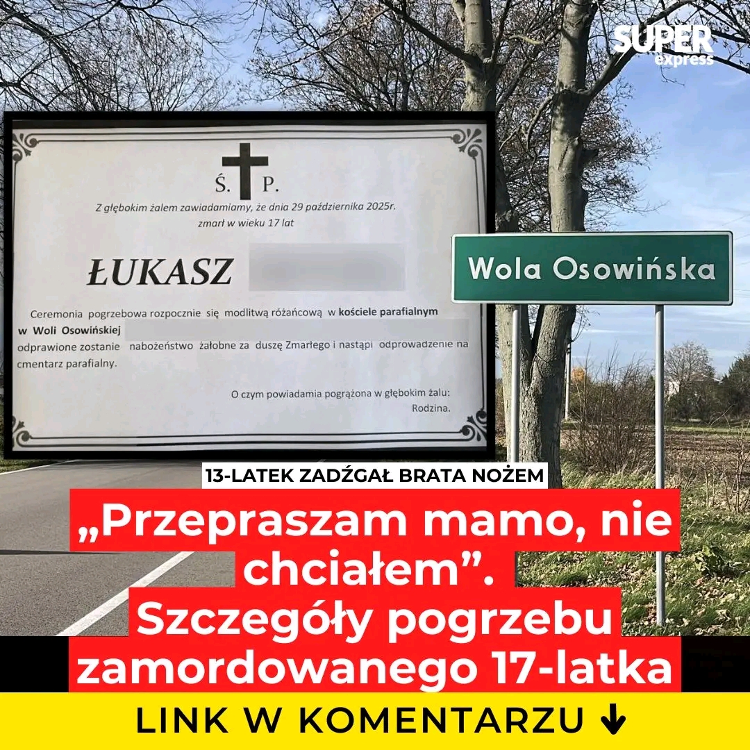 Łukasz M. († 17 l.), ofiara bratobójczej tragedii w Woli Osowińskiej pod Radzyniem Podlaskim zostanie pochowany we wtorek (4 listopada) na cmentarzu w rodzinnej miejscowości. Klepsydrę z taką informacją zamieściła na stronie internetowej parafia Narodzenia NMP, prosząc o modlitwę w intencji zmarłego tragicznie nastolatka. Dziesiątki komentarzy pod informacją zawierają te same słowa: „wyrazy współczucia dla całej rodziny”.
