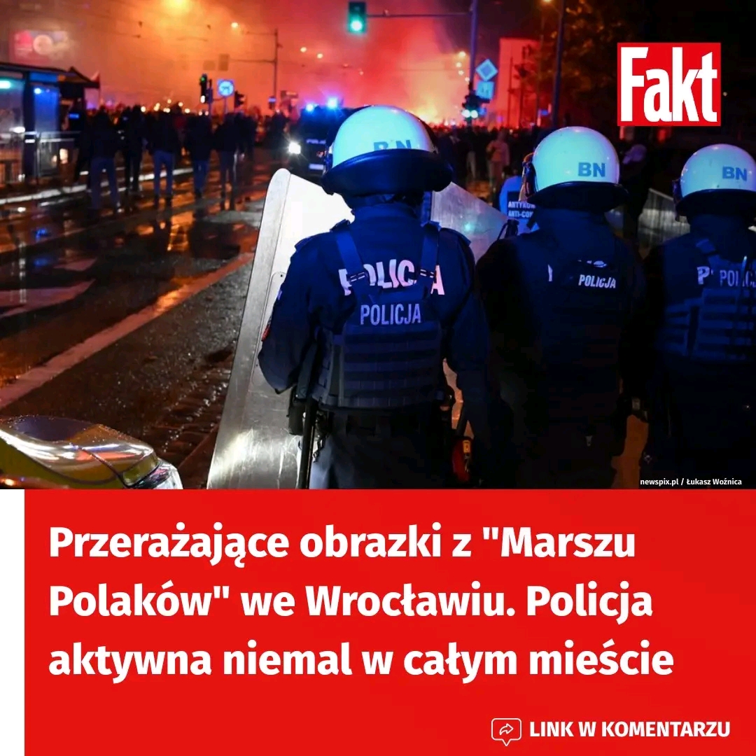 We Wrocławiu wciąż trwa “Marsz Polaków” zorganizowany z okazji Narodowego Święta Niepodległości. Z informacji, które “Fakt” uzyskał od policji, wynika, że ulicami miasta idzie około 3 tysięcy osób. Trasa jest tradycyjna — pochód ruszył spod Dworca Głównego i kieruje się w stronę Ostrowa Tumskiego. Choć dokładnie o 18:37 organizator oficjalnie “rozwiązał” zgromadzenie.