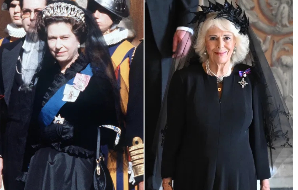During the Queen and King Charles’ historic visit to the Vatican on Thursday, Oct. 23, to meet Pope Leo and take part in a prayer service alongside him, Camilla, 78, notably wore a black dress and matching veil — reminiscent of looks her mother-in-law wore several decades ago during visits to the Vatican.