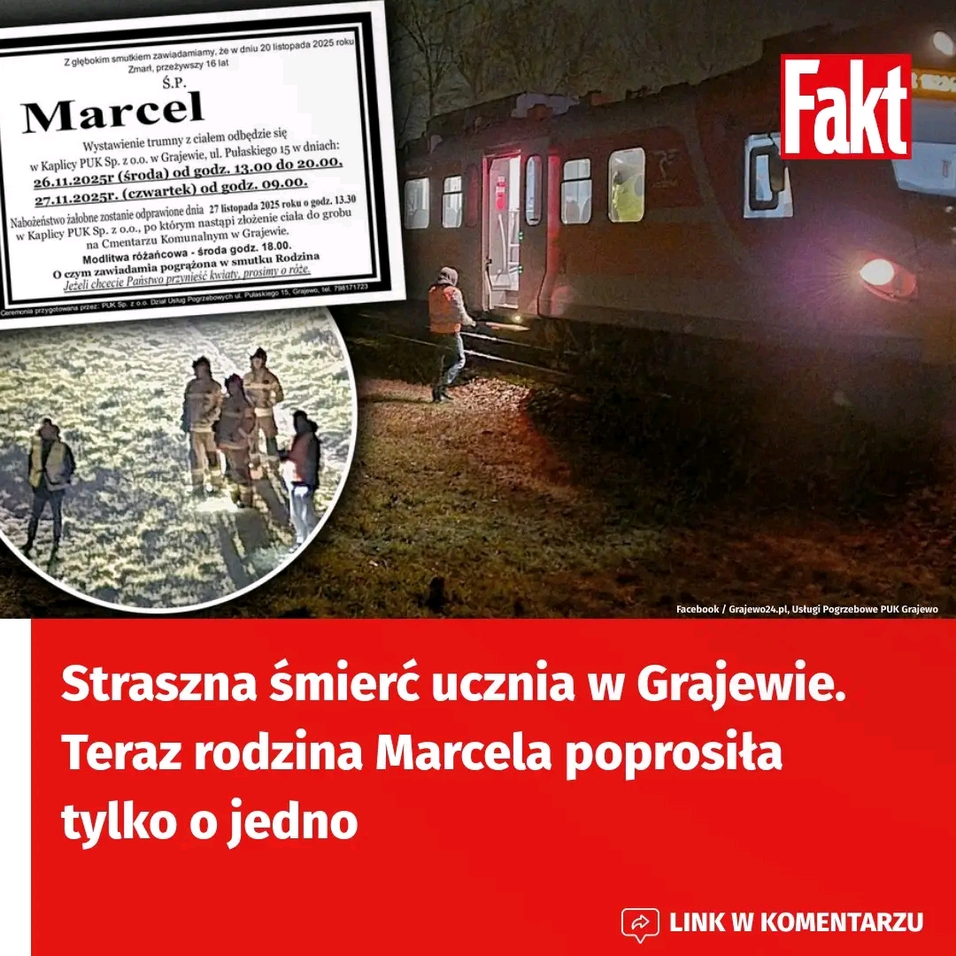 Miał zaledwie 16 lat. Mówią o nim zdolny, uśmiechnięty. Chodził do słynnej “Jednostki”, jak nazywany jest Zespół Szkół nr 2 im. 9. Pułku Strzelców Konnych w Grajewie. Był w drugiej klasie technikum. Miał zostać ekonomistą, ale swoją przyszłość wiązał też z polityką. Żadnego z tych planów już nie zrealizuje. Marcel nie żyje. Zginął na torach kolejowych. W czwartek, 27 listopada, odbędzie się jego pogrzeb. Rodzina chłopca ma tylko jedną prośbę do żałobników, którzy chcieliby go pożegnać. “Jeżeli chcecie Państwo przynieść kwiaty, prosimy o róże” — napisano w nekrologu.
