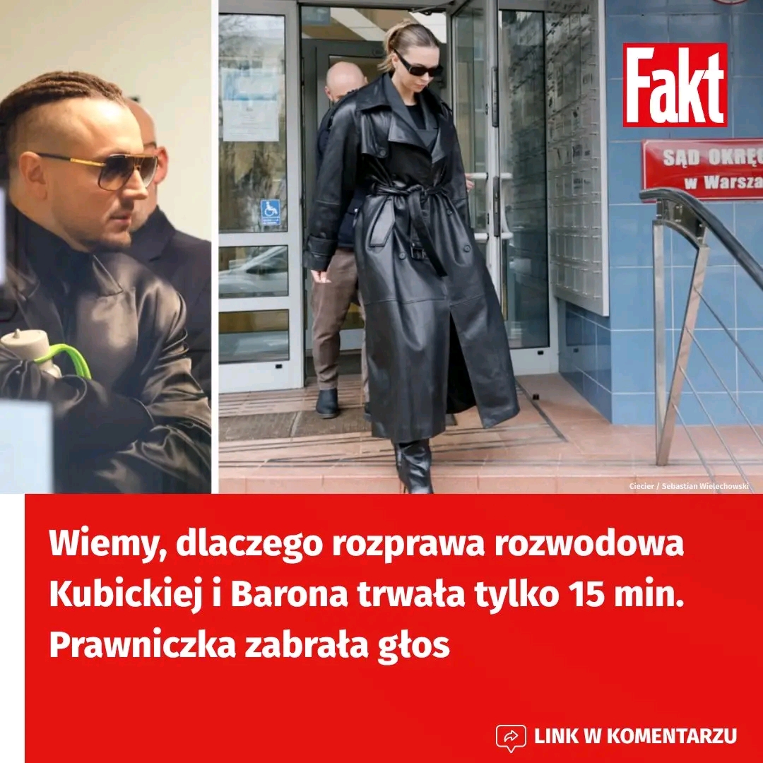 Pierwsza rozprawa rozwodowa zakończyła się po zaledwie 15 minutach. Małżonkowie opuścili budynek sądu w pośpiechu, nie udzielając komentarzy. Prawniczka Aleksandra Barona, mec. Anna Grabowska, w rozmowie z “Faktem” podkreśliła, że sprawa jest nadal w toku i najprawdopodobniej konieczne będą kolejne rozprawy, aby formalnie zakończyć małżeństwo.