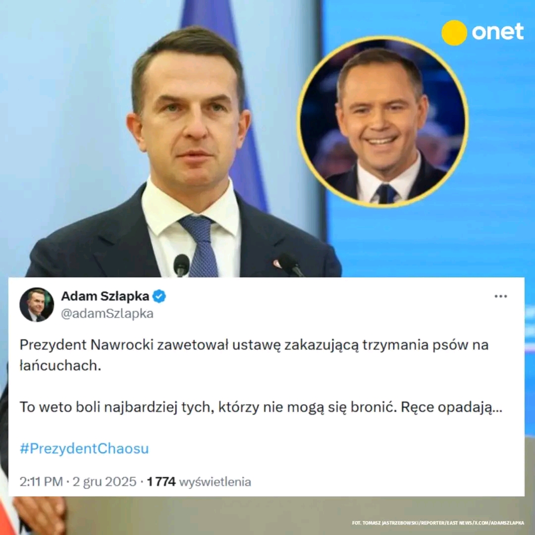 Prezydent Nawrocki zawetował ustawę zakazującą trzymania psów na łańcuchach. To weto boli najbardziej tych, którzy nie mogą się bronić. Ręce opadają…” — napisał na portalu X rzecznik rządu Adam Szłapka. W ten sposób odniósł się do prezydenckiego weta tzw. ustawy łańcuchowej.