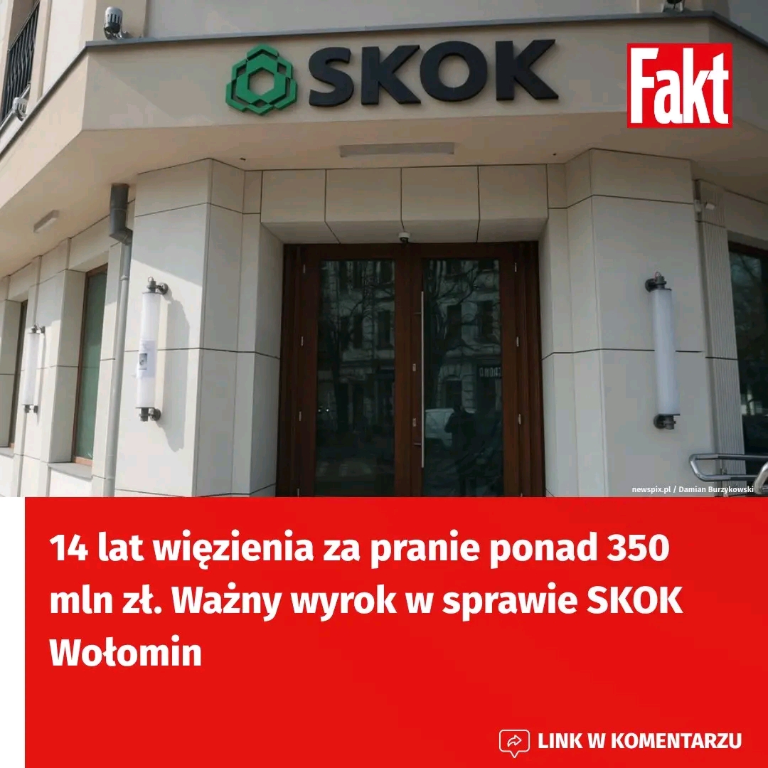 14 lat więzienia — tyle ma spędzić za kratami Polaszczyk, którego prokuratura oskarżyła o “wypranie” 350 mln zł. Do tego dochodzi grzywna 510 tys. zł i nakaz wpłaty blisko 35 mln zł na rzecz SKOK Wołomin jako część naprawienia szkody.