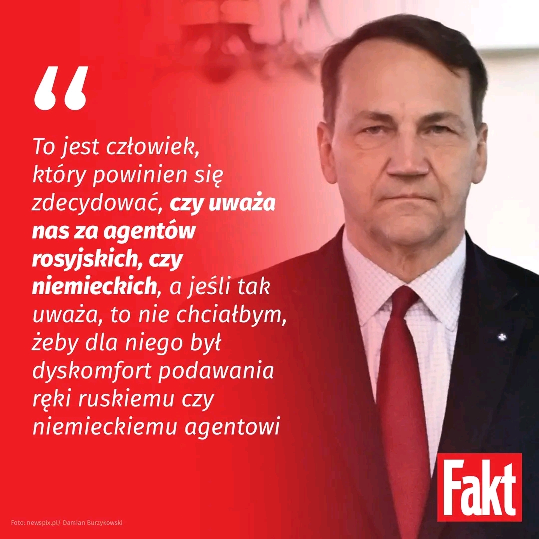 Sikorski krótko odpowiedział na pytanie “Faktu” o Cenckiewicza: — To jest człowiek, który powinien się zdecydować, czy uważa nas za agentów rosyjskich, czy niemieckich, a jeśli tak uważa, to nie chciałbym, żeby dla niego był dyskomfort podawania ręki ruskiemu czy niemieckiemu agentowi.
