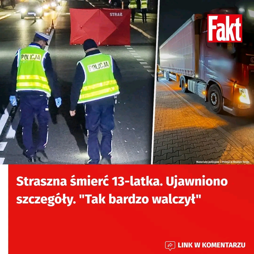 Zlecona została sekcja zwłok 13-latka. Śledczy liczą, że uda się dokładnie ustalić, co było przyczyną śmierci chłopca i kiedy do niej doszło. Czy w momencie zderzenia z ciężarówką, czy gdy dziecko było “wleczone przez pojazd ciężarowy”. Od tego, jak wskazał rozmówca lokalnego serwisu, zależy ewentualna odpowiedzialność kierowcy.