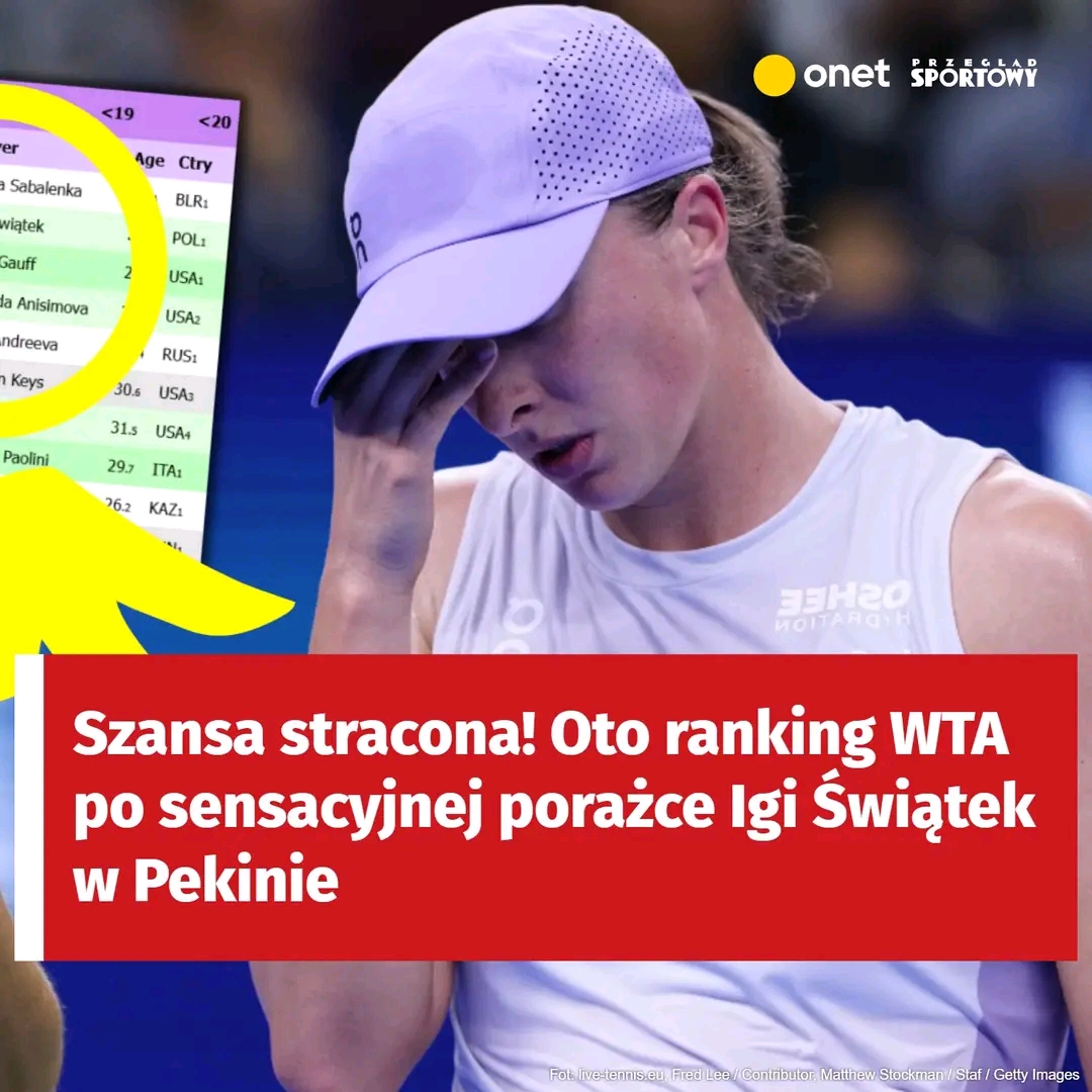 Chodzi oczywiście o sytuację w rankingu WTA Live. Na początku należy zaznaczyć, że Polka w Pekinie nie broniła żadnych punktów, bo rok temu nie brała udziału w tych zawodach. Mogła więc nadrobić sporo do będącej wciąż światową “jedynką” Aryny Sabalenki, która z zawodów w stolicy Chin się wycofała. Porażka w czwartej rundzie oznacza jednak, że rankingowych “oczek” nie uda się zgromadzić zbyt wielu.