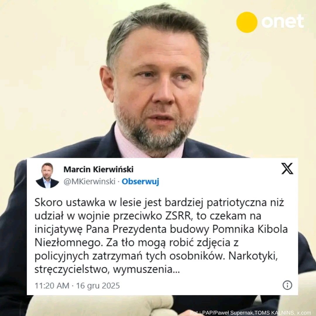 Skoro ustawka w lesie jest bardziej patriotyczna niż udział w wojnie przeciwko ZSRR, to czekam na inicjatywę Pana Prezydenta budowy Pomnika Kibola Niezłomnego. Za tło mogą robić zdjęcia z policyjnych zatrzymań tych osobników. Narkotyki, stręczycielstwo, wymuszenia…” — napisał na portalu X.