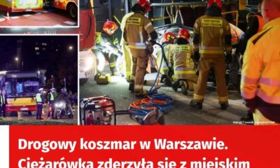Drogowy koszmar w Warszawie. Ciężarówka zderzyła się z miejskim autobusem. Są ranni