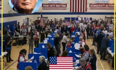 The image features a prominent portrait of Donald Trump overlaid on a bustling scene of an American polling station. The graphic, labeled with “Breaking News” and...