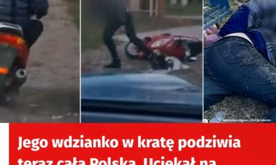 Jego wdzianko w kratę podziwia teraz cała Polska. Uciekał na skuterze aż się kurzyło