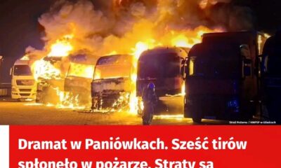 Pożar w Paniówkach zniszczył sześć tirów, a strażacy walczyli z żywiołem przez osiem godzin. Straty są ogromne, ale nikt nie ucierpiał.