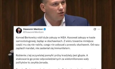 Konrad Berkowicz został przyłapany na próbie kradzieży w Ikei — poinformował Donald Tusk. W obronie polityka Konfederacji stanął Sławomir Mentzen. “Z wielu towarów mniejsza część mu...