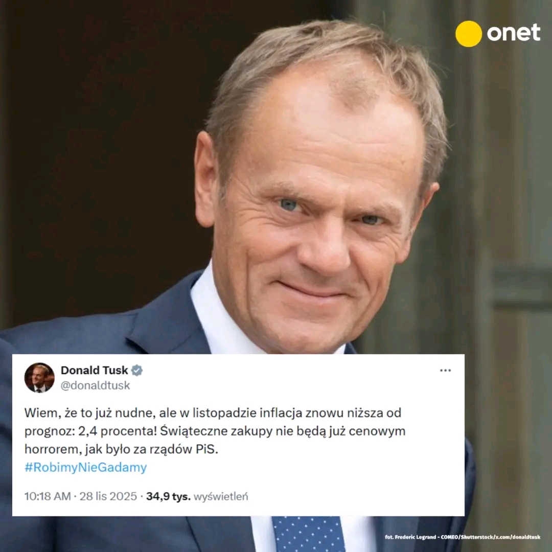 “Wiem, że to już nudne, ale w listopadzie inflacja znowu niższa od prognoz: 2,4 procent. Świąteczne zakupy nie będą już cenowym horrorem, jak było za rządów PiS” — napisał Tusk.