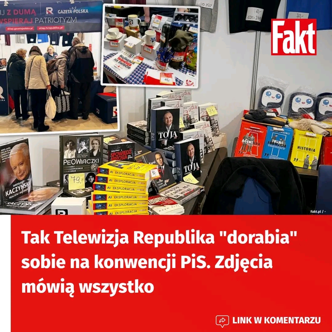 Ruszyła konwencja programowa PiS. W katowickim centrum kongresowym zgromadzili się najważniejsi politycy partii i zaproszeni przez nich eksperci. Tymczasem na korytarzu na zebranych czeka sklep Telewizji Republika i “Gazety Polskiej”. Oferta jest szeroka — od książek, przez koszulki, po zastawę kuchenną. “Fakt” sprawdził, ile trzeba zapłacić za specjalne gadżety.