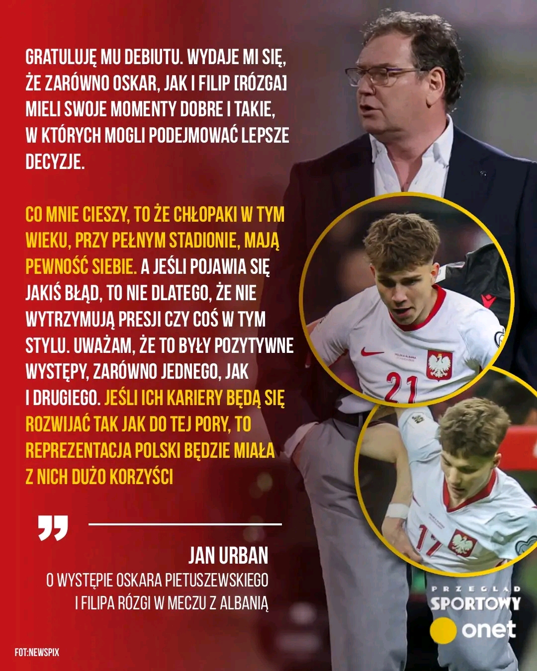 — Co mnie cieszy, to że chłopaki w tym wieku, przy pełnym stadionie, mają pewność siebie. A jeśli pojawia się jakiś błąd, to nie dlatego, że nie wytrzymują presji czy coś w tym stylu. Uważam, że to były pozytywne występy, zarówno jednego, jak i drugiego. Jeśli ich kariery będą się rozwijać tak jak do tej pory, to reprezentacja Polski będzie miała z nich dużo korzyści — zapewnił.