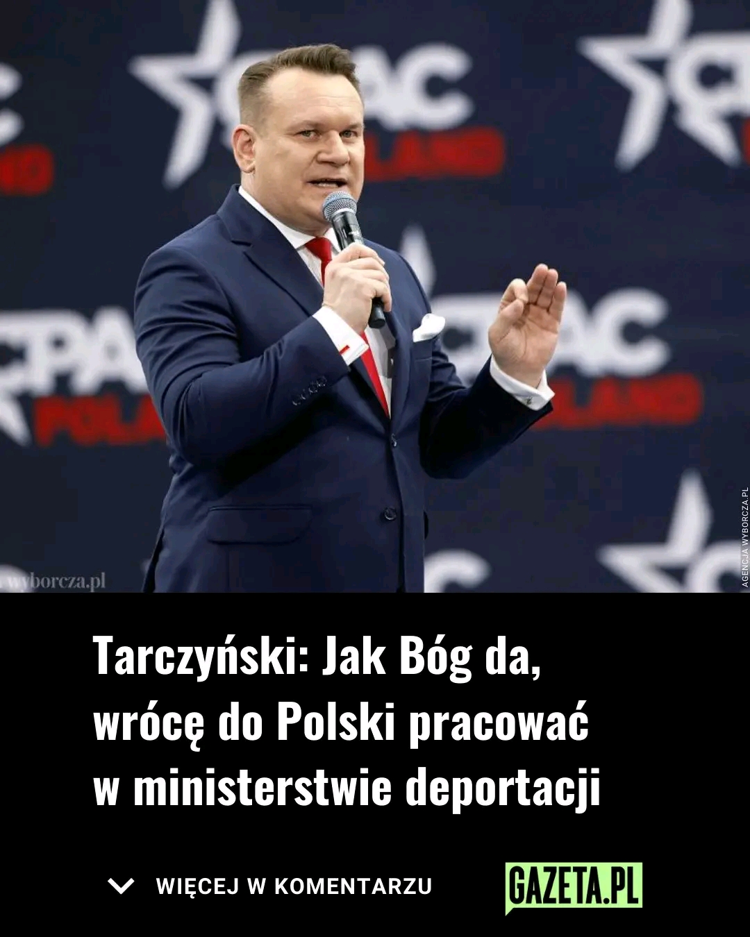 Tarczyński powiedział też, że “chce silnego państwa, silnych granic, zdecydowanych działań”. – To, co dzieje się w Ameryce, zaraz pojawi się w Europie. (…) Ja nie namawiam do tego, aby mordować ludzi, bo takie były sugestie, że ja się cieszę z czyjejś śmierci. Nie, nie cieszę się z niczyjej śmierci, nie namawiam do niczego, ale chcę silnego państwa, ludzi, którzy nie boją się nas bronić – stwierdził. – Nie wycofam się z żadnego swojego słowa. Uważam, że wykonali dobrą robotę. Stany Zjednoczone teraz są silnym państwem. Bardzo dobra robota. Chciałbym, aby w Polsce było tak samo, aby państwo było silne. Aby nie płaciło, aby żołnierze nie musieli płacić odszkodowań i aby nie bali się używać broni – podkreślił europoseł PiS. Następnie z ust polityka padła deklaracja. – Jak Bóg da i będzie wola, wrócę do Polski pracować w ministerstwie deportacji, bo to jest teraz moim zdaniem najważniejsze. Jeżeli nie dokonamy masowej deportacji nielegalnych, nie będzie inwestycji w Polsce. Polska jest perłą Europy przez to, jak my przez osiem lat traktowaliśmy migrantów i migrację. To dzięki nam jest stosunkowo bezpieczna – oznajmił Dominik Tarczyński.