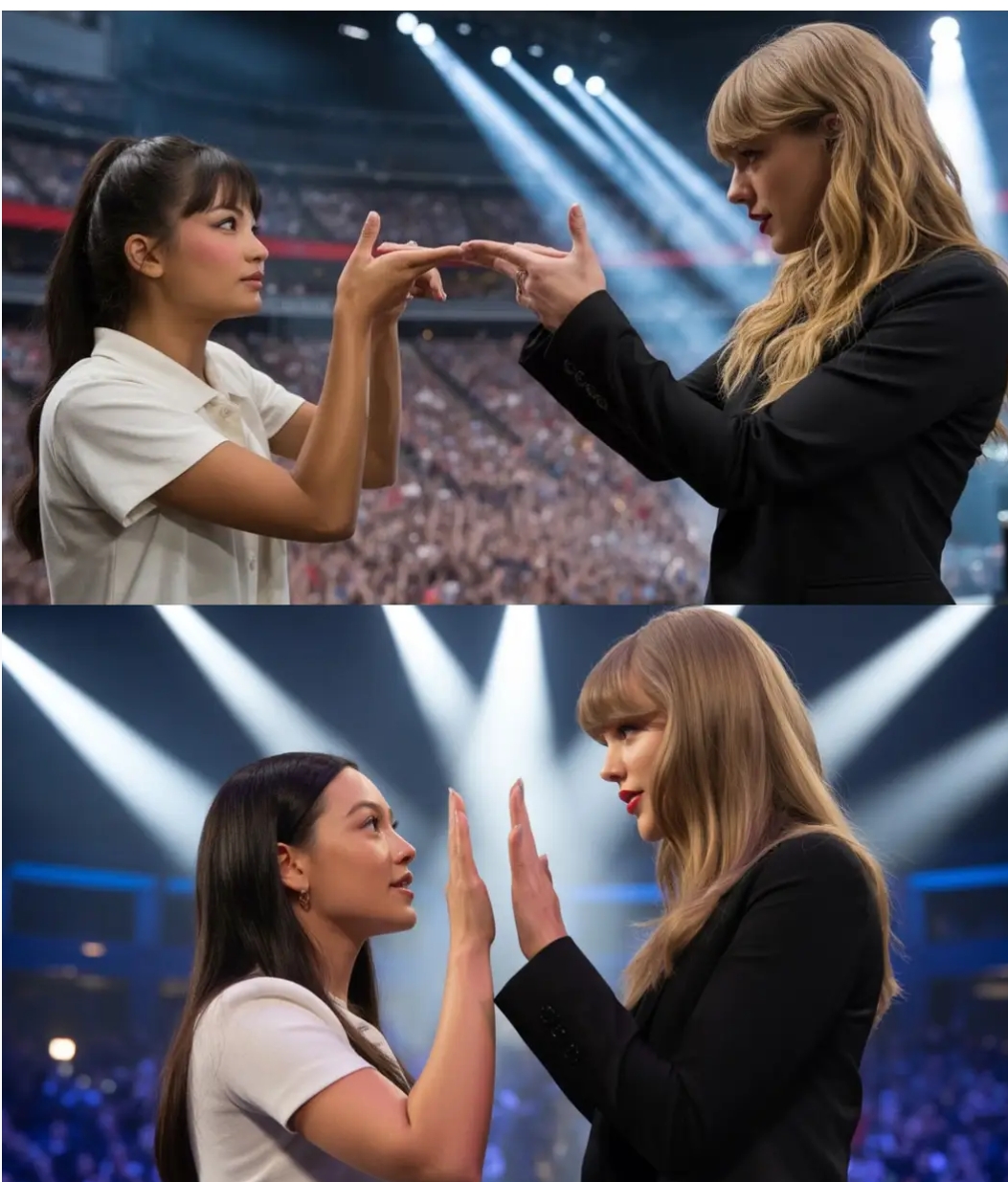 She shook her head. “No.” Taylor’s facial expression changed. Her eyes filled with tears. “Do you use sign language?” Mayia nodded again. “Yes.” Taylor stopped. 68,000 people held their breath. Taylor didn’t know any sign language, but at that moment, she wanted to do something. “What’s your name?” Taylor asked.