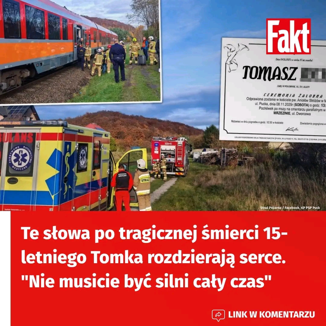 Dopiero teraz do mnie dociera, że już Cię z nami nie ma… Trzymaj się Bracie” — brzmi jeden z wpisów opublikowanych w mediach społecznościowych po tragicznej śmierci 15-letniego Tomka, który 4 listopada zginął na torach kolejowych w Połchowie niedaleko Pucka (woj. pomorskie). Chłopiec najprawdopodobniej targnął się na swoje życie. Na profilu Tomka pojawiły się też inne poruszające i niezwykle ważne słowa skierowane do jego zrozpaczonych i zdezorientowanych przyjaciół: “Nie musicie być silni cały czas. Nie wstydźcie się mówić, że jest źle. Zawsze jest ktoś, kto chce was usłyszeć — tylko trzeba dać mu szansę” — czytamy.
