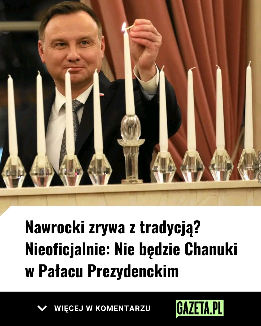 Przedstawiciele społeczności żydowskiej przekazali “Rzeczpospolitej”, że w tym roku nie otrzymali oni zaproszenia na obchody Chanuki w Pałacu Prezydenckim. Z kolei Biuro Mediów i Listów Prezydenta nie odpowiedziało na pytanie, czy uroczystość się odbędzie. Może to wskazywać na to, że Chanuki w tym roku nie będzie. Jak zauważa dziennik, Karol Nawrocki brał pod uwagę taki scenariusz jeszcze podczas kampanii wyborczej. Udzielił wówczas wywiadu RMF FM, gdzie jedno z pytań od słuchaczy brzmiało tak: “Czy zapali pan świece chanukowe zgodnie z tradycją, którą podtrzymał Andrzej Duda, a zapoczątkował Lech Kaczyński?”. – Nie, ja swoje poglądy i swoje przywiązanie do wartości chrześcijańskich traktuję poważnie, więc obchodzę święta, które są bliskie mojej osobie – odpowiedział wówczas.