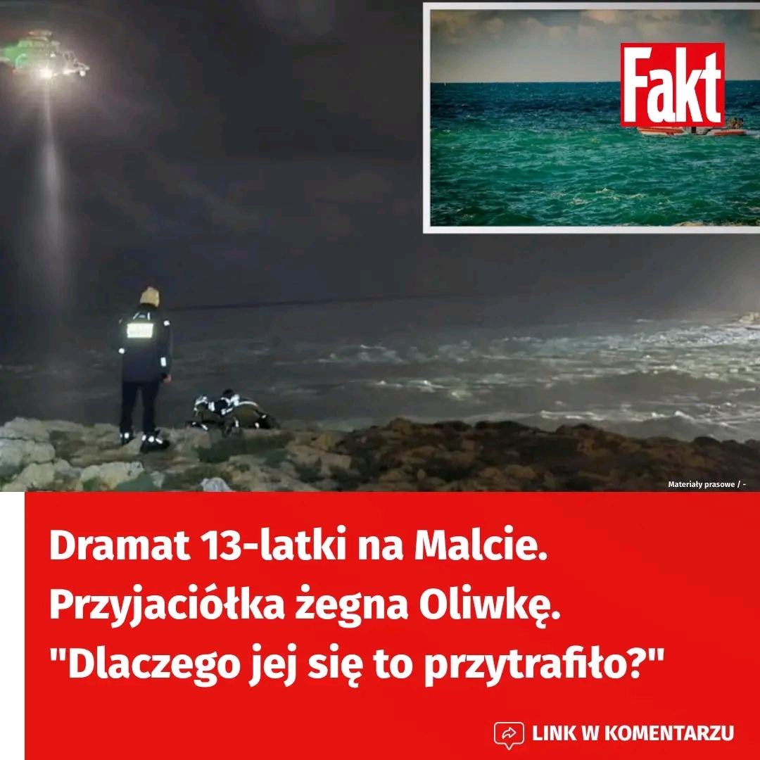 Tragiczna śmierć 13-letniej Polki na Malcie wstrząsnęła wieloma osobami. Dziewczynkę porwała wzburzona fala morska. Łzy płyną na Malcie, ale płyną również w Polsce. Komentarz z pożegnaniem zamieściła w sieci przyjaciółka Oliwki, Michalina. — Dlaczego to przytrafiło się akurat jej? — napisała w języku angielskim, komentując wpis jednej z mieszkanek wyspy.