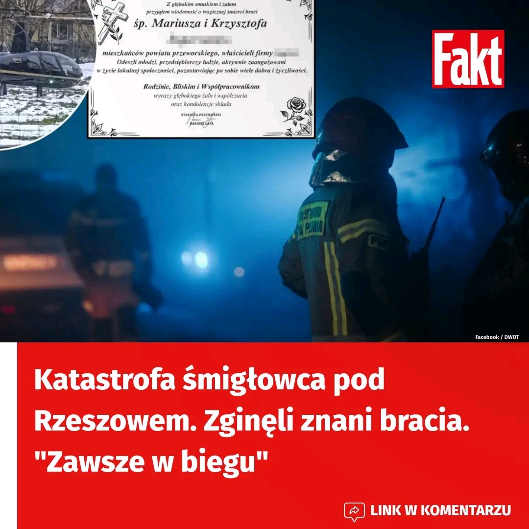 W katastrofie śmigłowca pod Rzeszowem zginęły dwie osoby. Początkowo informowano od dwóch spokrewnionych mężczyznach, teraz już wiadomo, kim są dokładnie. Krzysztof i Mariusz byli znanymi przedsiębiorcami. – Z wielkim smutkiem przyjąłem wiadomość o śmierci Mariusza i Krzysztofa, właścicieli firmy SupFol, pochodzących z powiatu przeworskiego – poinformował Starosta Przeworski Dariusz Łapa.