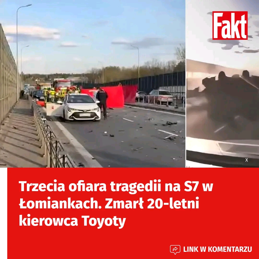 Prokuratura potwierdziła kolejne tragiczne informacje w sprawie wypadku na trasie S7 w Łomiankach na Mazowszu. W nocy z 15 na 16 kwietnia zmarł 20-letni kierowca Toyoty, który od kilku dni walczył o życie w szpitalu. W tym samym aucie na miejscu zginęli jego pasażerowie. Cała trójka wracała z pikniku, gdy w ich samochód uderzył pijany kierowca Audi.