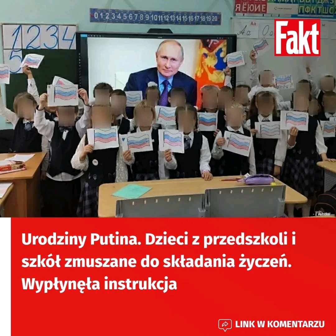 Na VKontakte zaroiło się od zdjęć publikowanych przez przedszkola i szkoły, które pokazują uroczystości z okazji urodzin rosyjskiego dyktatora. Kilkulatki z rosyjskimi flagami w dłoniach przed wielkim zdjęciem Putina, dzieci trzymające jego portrety, uczniowie składający życzenia na nagraniach — tak wyglądał wtorek w większości placówek.