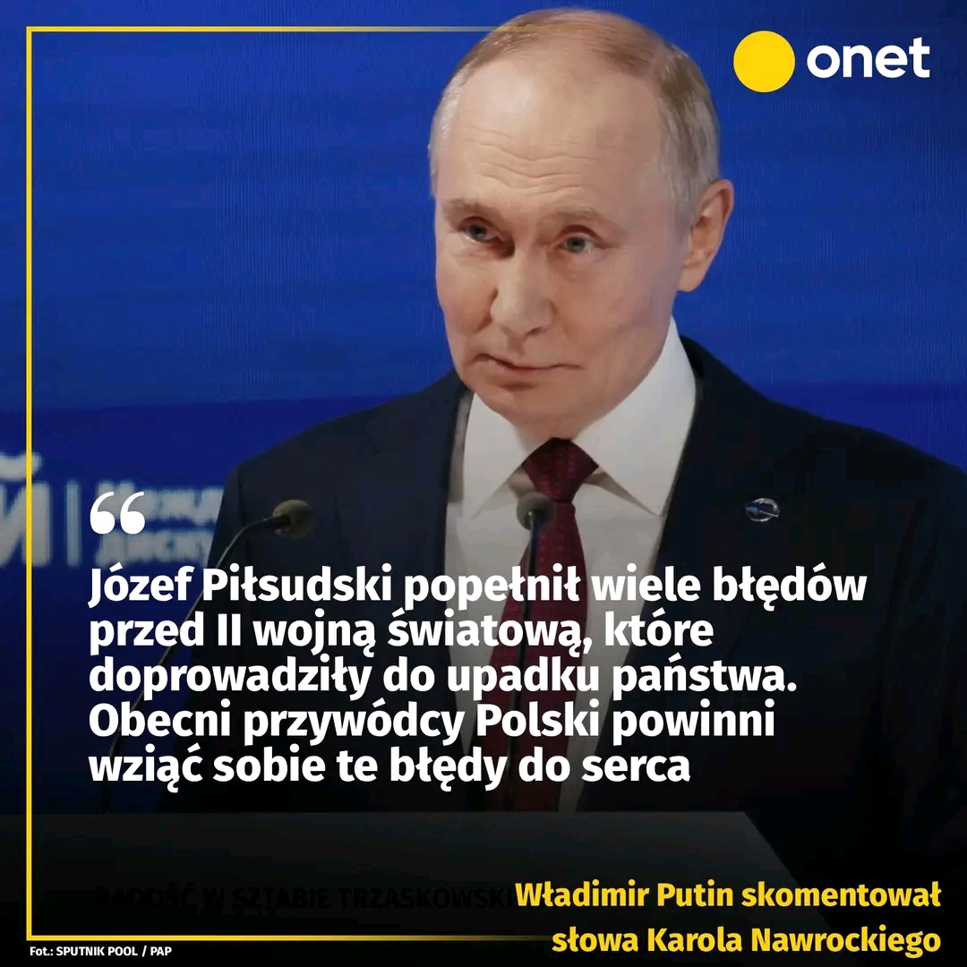 Józef Piłsudski popełnił wiele błędów przed II wojną światową, które doprowadziły do upadku państwa. Obecni przywódcy Polski powinni wziąć sobie te błędy do serca — powiedział Władimir Putin na sesji plenarnej Klubu Wałdajskiego, cytowany przez TASS. Odniósł się w ten sposób do słów Karola Nawrockiego, który w Radiu ZET powiedział, że praktycznie każdego dnia rozmawia w Belwederze, w którym mieszka od jakiegoś czasu, z “duchem marszałka Piłsudskiego”.
