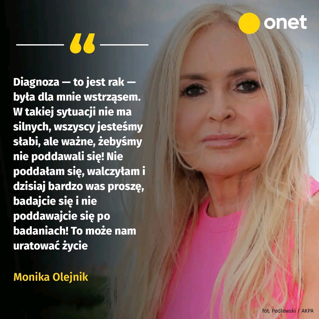 W maju ubiegłego roku Monika Olejnik poinformowała, że zdiagnozowano u niej nowotwór piersi. Prowadząca “Kropkę nad i” wyjawiła wtedy, że w związku z chorobą przeszła już operację, po której “czuła się lepiej”. Zaapelowała wtedy innych, by regularnie się badali i “nie poddawali się po badaniach”.
