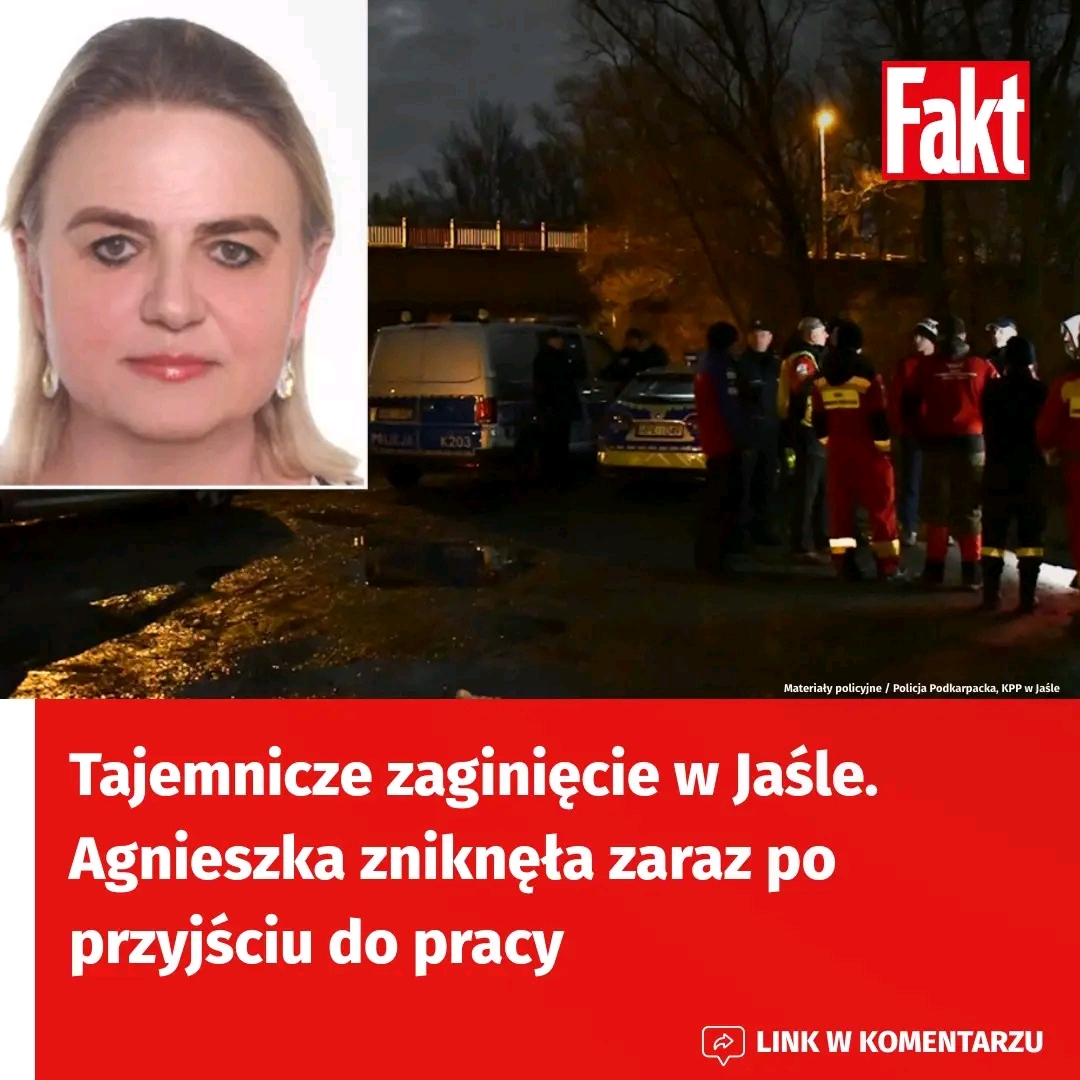 Z ustaleń śledczych wynika, że pani Agnieszka opuściła miejsce pracy przy ul. Szkolnej około godz. 6.30. Od tego momentu nie wróciła do domu i nie dała żadnego znaku życia. Jej telefon milczy, nie ma z nią żadnego kontaktu.