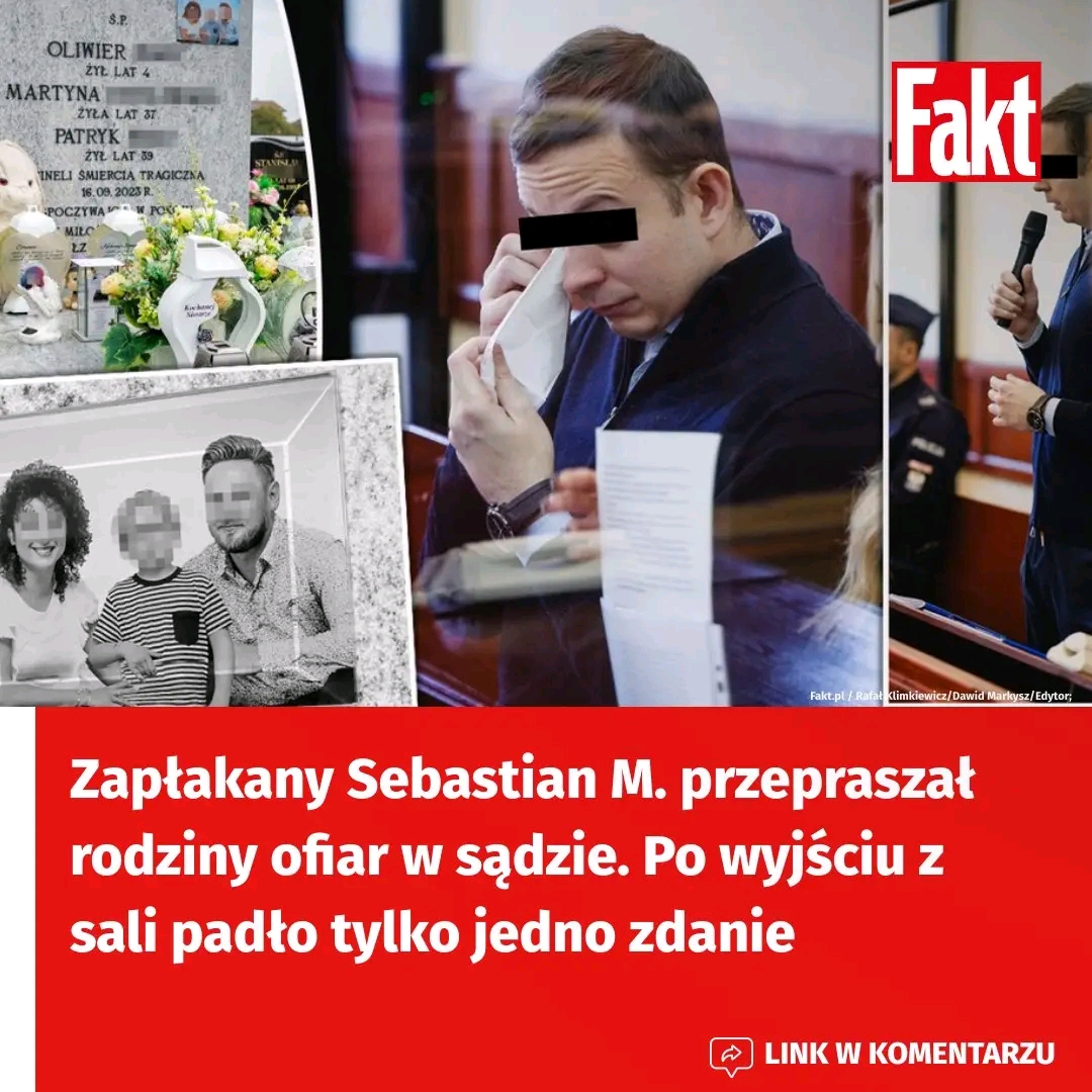 Podczas rozprawy Sebastian M. zwrócił się na sali sądowej po raz pierwszy do rodzin i przeprosił je. Nie za to, że spowodował wypadek, ale za, jak określił, “to co się stało”. Uronił kilka łez. Nie przyznał jednak, że jest sprawcą wypadku. Z jego słów wynikało jedynie, że przeprasza za zdarzenie z 16 września 2023 r., którego sam był uczestnikiem, co w dalszym ciągu jest zgodne z jego linią obrony.