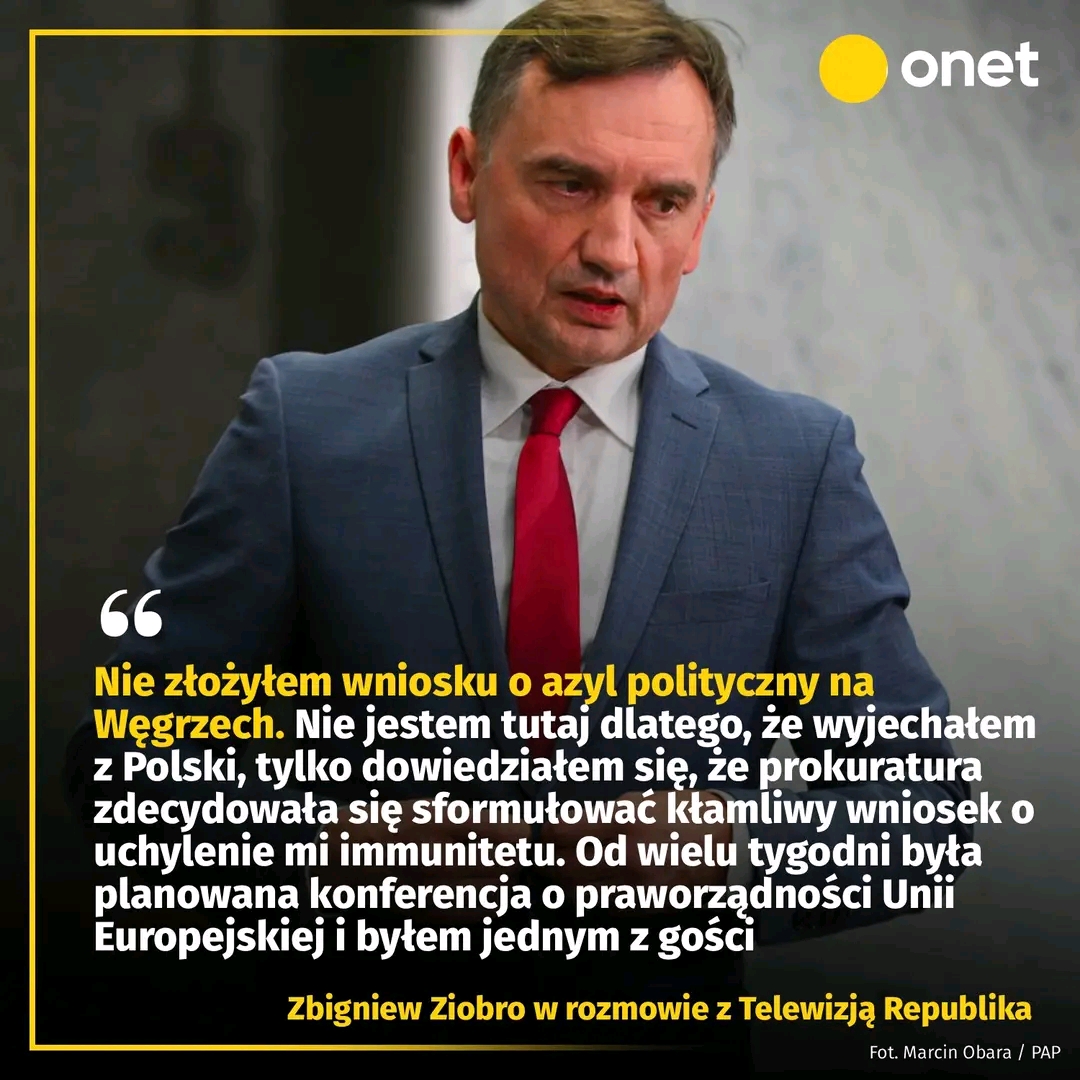 Nie złożyłem wniosku o azyl polityczny na Węgrzech. Nie jestem tutaj dlatego, że wyjechałem z Polski, tylko dowiedziałem się, że prokuratura zdecydowała się sformułować kłamliwy wniosek o uchylenie mi immunitetu. Od wielu tygodni była planowana konferencja o praworządności Unii Europejskiej i byłem jednym z gości — powiedział Zbigniew Ziobro w rozmowie z Telewizją Republika.