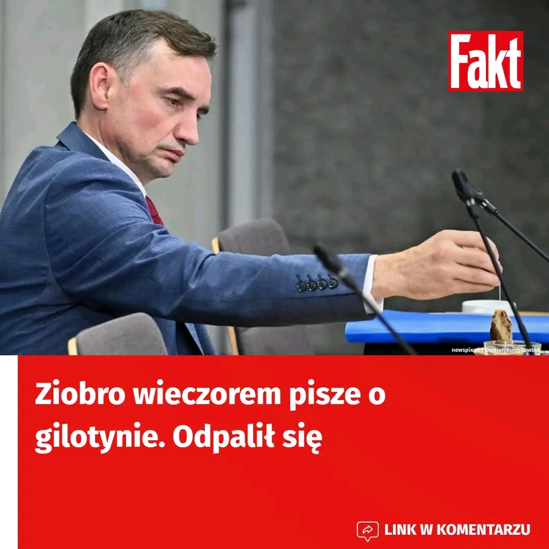 “Towarzyszu Żurek, skoro nie potrafi mnie Pan skutecznie zatrzymać, to wymyślił Pan teraz Trybunał Stanu. Dlaczego tak mało ambitnie? A może od razu gilotynę? Tak to jest, gdy próbuje się udawać silnego drwala, a jest się jedynie fujarą” — napisał były minister sprawiedliwości.