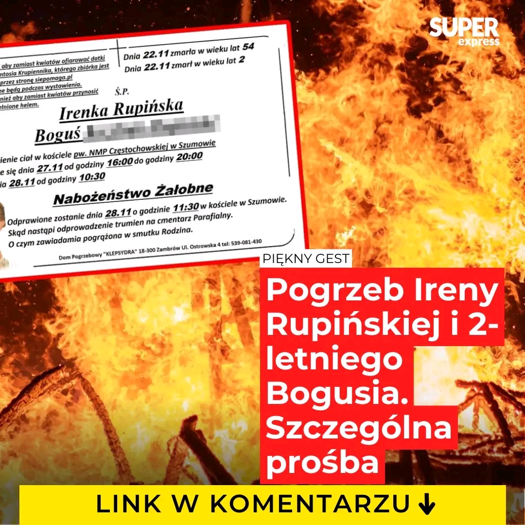W Szumowie trwają przygotowania do pożegnania Ireny Rupińskiej i jej 2-letniego wnuczka Bogusia, którzy zginęli w tragicznym pożarze domu 22 listopada. Rodzina przekazała wyjątkową prośbę dotyczącą uroczystości pogrzebowych — zamiast kwiatów bliscy proszą o wsparcie zbiórki na leczenie małego Antosia Krupiennika. Wiadomo już także, kiedy odbędzie się pogrzeb.
