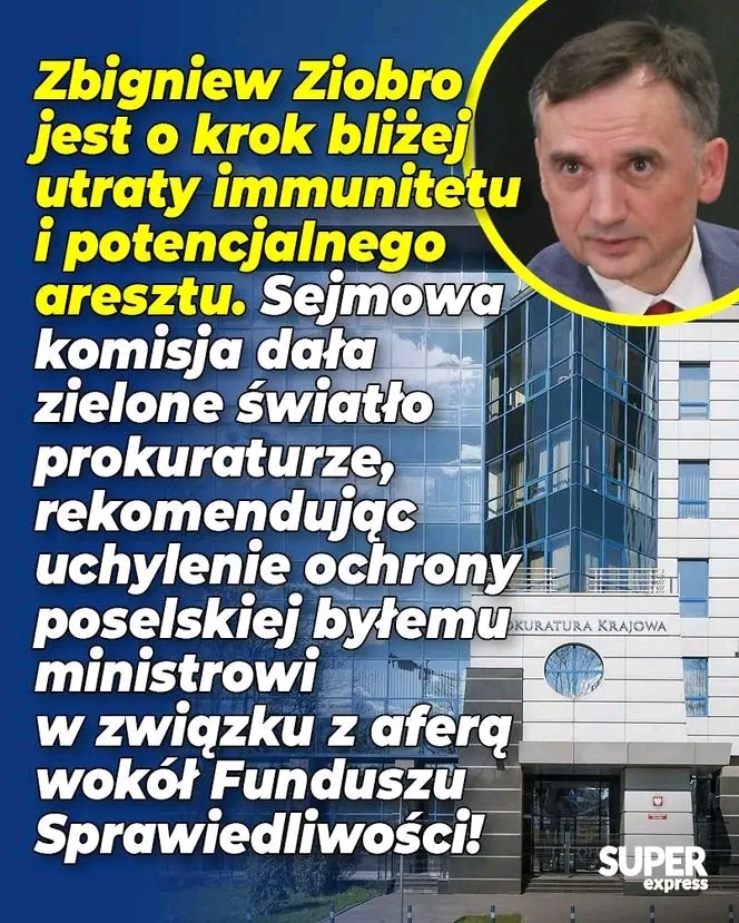 Komisja regulaminowa poparła wniosek o uchylenie immunitetu Zbigniewowi Ziobrze, zgadzając się na jego zatrzymanie i aresztowanie.