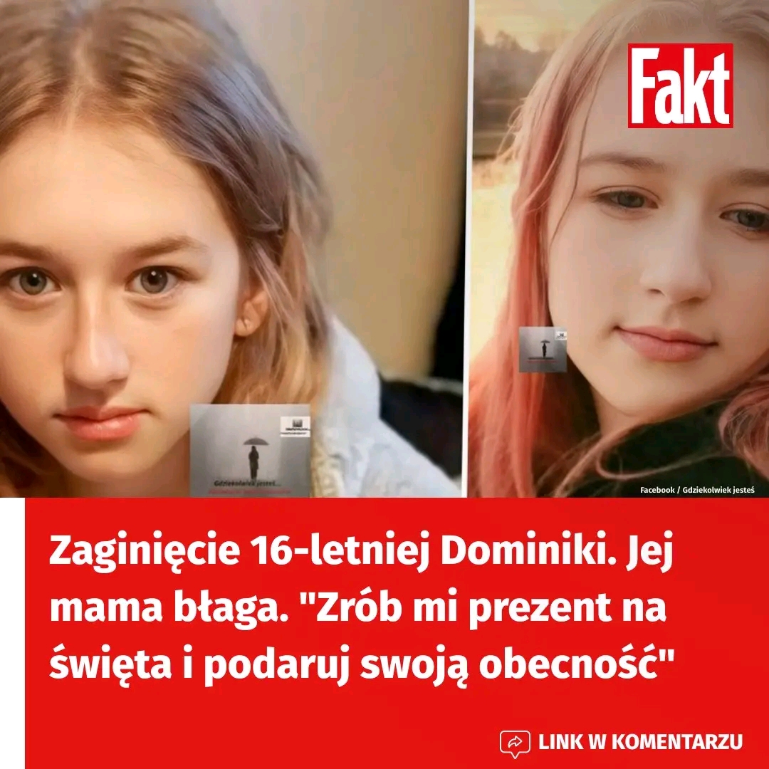 Pani Anita boi się świąt. Nie wyobraża sobie, by przy wigilijnym stole zabrakło jej ukochanej córki Dominiki. 16-latka zaginęła pod koniec listopada. Do tej pory nie dała znaku życia. “Córeczko kochana, proszę zrób mi prezent na święta i podaruj mi swoją obecność” – błaga zrozpaczona matka.